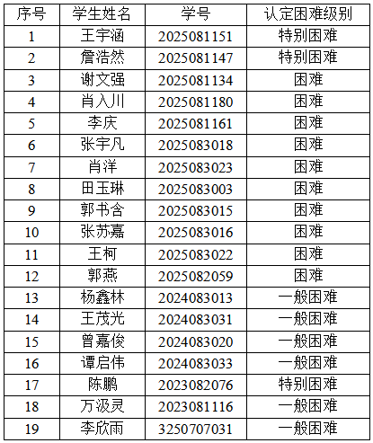 根据教育部文件精神要求,按照《成都信息工程大学家庭经济困难学生认定办法》及《成信学工处发〔2026〕2号 关于开展2025-2026学年家庭经济困难本科学生认定动态调整工作的通知》,本着实事求是、客观、公平、公正、公开的原则,软件工程学院开展了家庭经济困难学生认定工作。本次认定按照学生个人主动申请,班级评议小组根据学生自身情况进行评定,学院家庭经济困难学生认定工作组审核,拟确定以下同学为我院家庭经济困难学生,现予以公示,名单见下表: